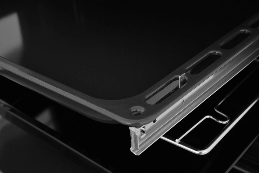 i Выдвижные металлические полозья, которые легко выезжают за пределы камеры духовки вместе с противнем, не давая ему упасть.