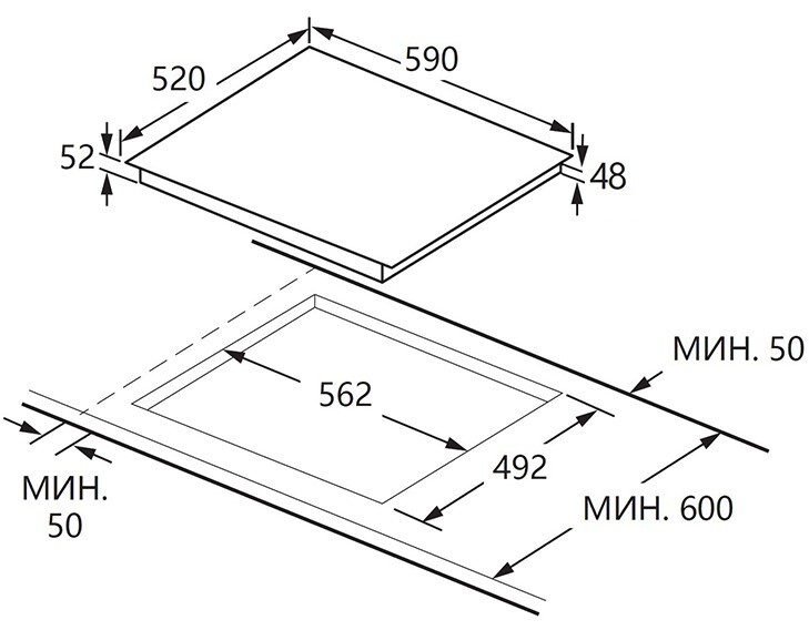 i Характер огранки фаски на внешней стороне варочной панели. Металлические рамки предотвращают забивание монтажных швов крошками и пылью.
