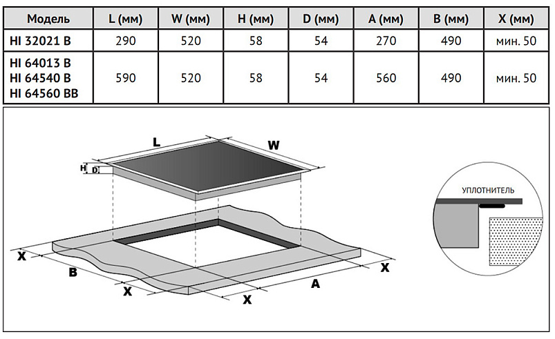 Свободная зона (Flexi зона) конфорка (мм/кВт)