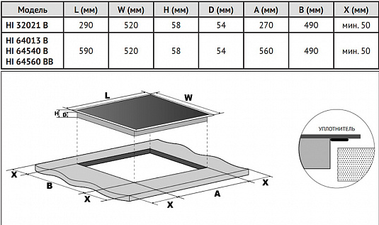 Свободная зона (Flexi зона) конфорка (мм/кВт)