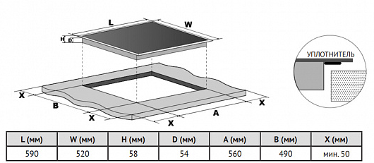 i Характер огранки фаски на внешней стороне варочной панели. Металлические рамки предотвращают забивание монтажных швов крошками и пылью.