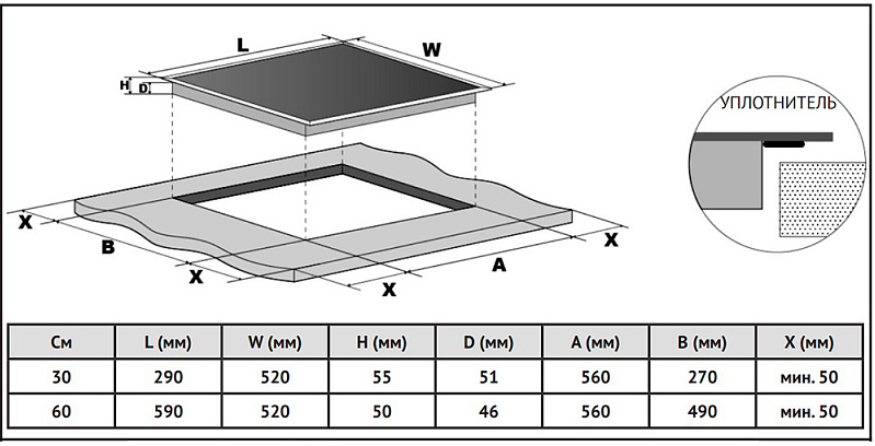 Свободная зона (Flexi зона) конфорка (мм/кВт)