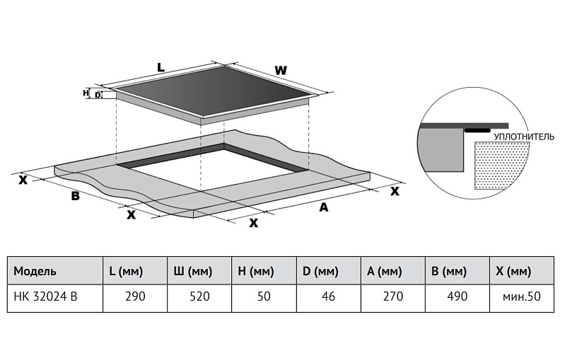 Свободная зона (Flexi зона) конфорка (мм/кВт)