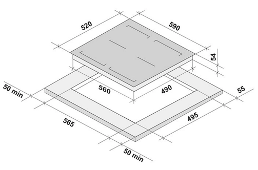 i Характер огранки фаски на внешней стороне варочной панели. Металлические рамки предотвращают забивание монтажных швов крошками и пылью.