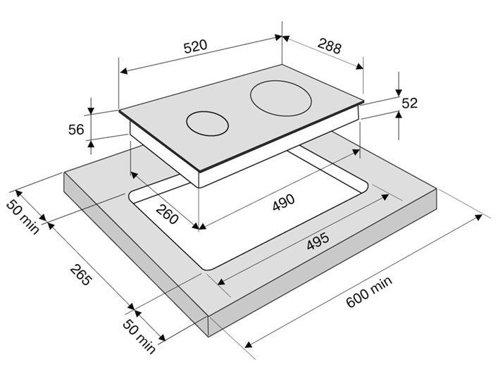 i Характер огранки фаски на внешней стороне варочной панели. Металлические рамки предотвращают забивание монтажных швов крошками и пылью.