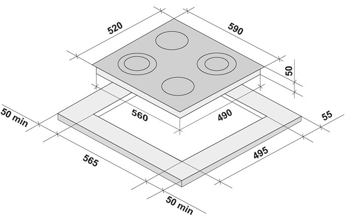 i Характер огранки фаски на внешней стороне варочной панели. Металлические рамки предотвращают забивание монтажных швов крошками и пылью.