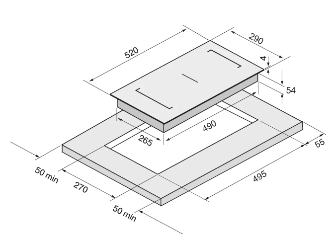 i Характер огранки фаски на внешней стороне варочной панели. Металлические рамки предотвращают забивание монтажных швов крошками и пылью.