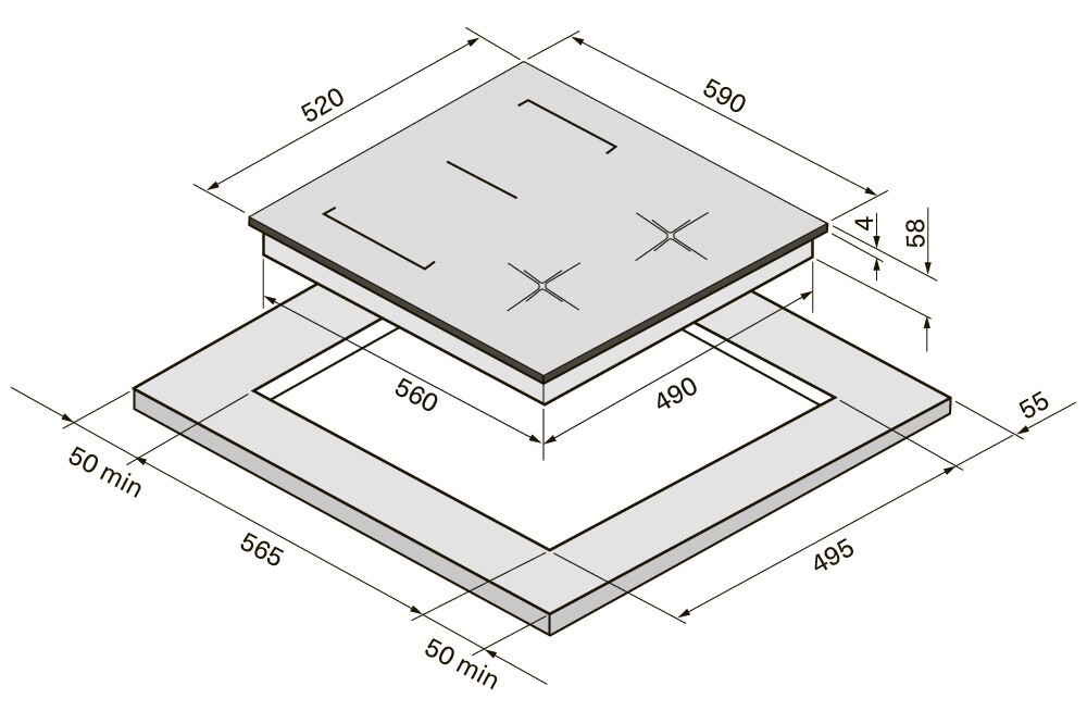 i Характер огранки фаски на внешней стороне варочной панели. Металлические рамки предотвращают забивание монтажных швов крошками и пылью.