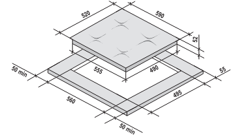 i Характер огранки фаски на внешней стороне варочной панели. Металлические рамки предотвращают забивание монтажных швов крошками и пылью.