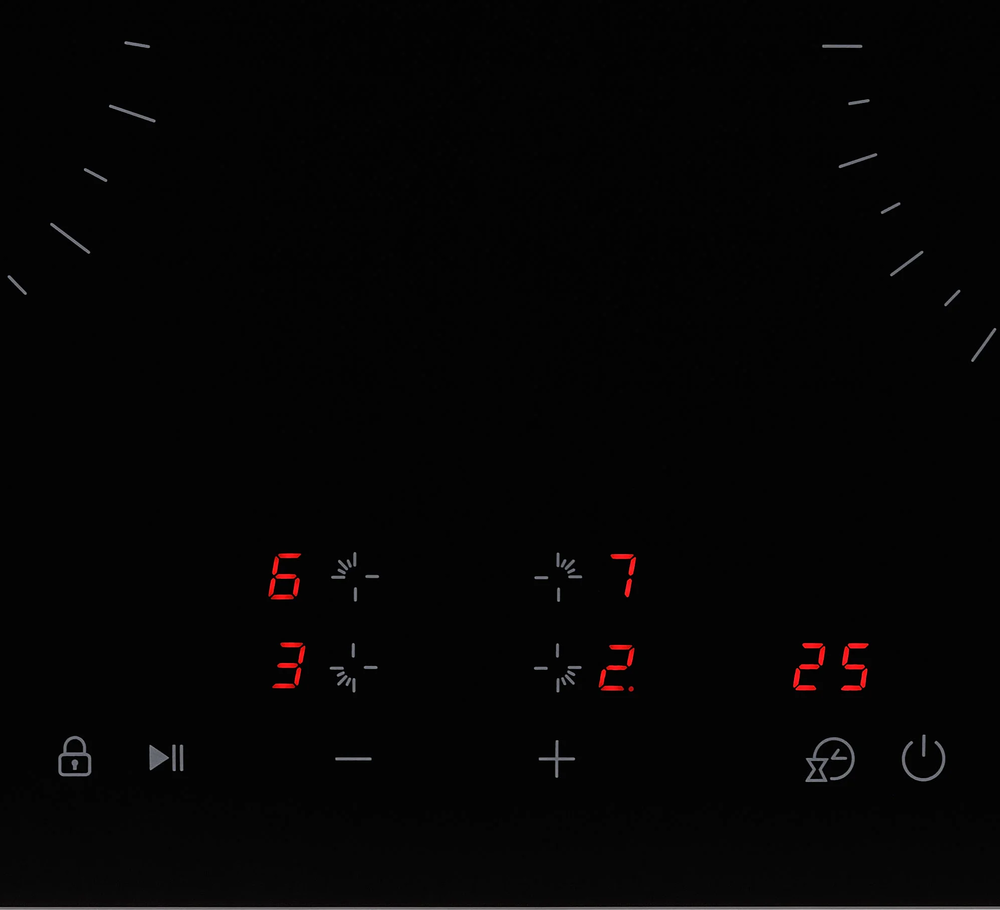 i Расположение панели управления варочной поверхностью относительно конфорок. Если панель расположена сбоку, она будет справа.
