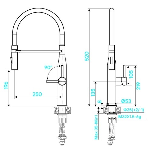 i Встроенная в кран насадка на длинном гибком шланге с металлической оплеткой. Насадки с кнопкой могут переключать обычный излив воды на душ.