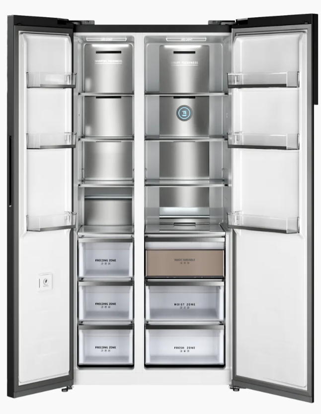 i Морозильная камера может быть расположена сверху, снизу от основной камеры, Side-by-Side. Также она может отсутствовать вовсе.