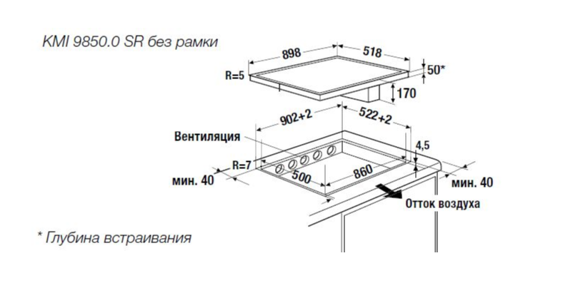 i Характер огранки фаски на внешней стороне варочной панели. Металлические рамки предотвращают забивание монтажных швов крошками и пылью.