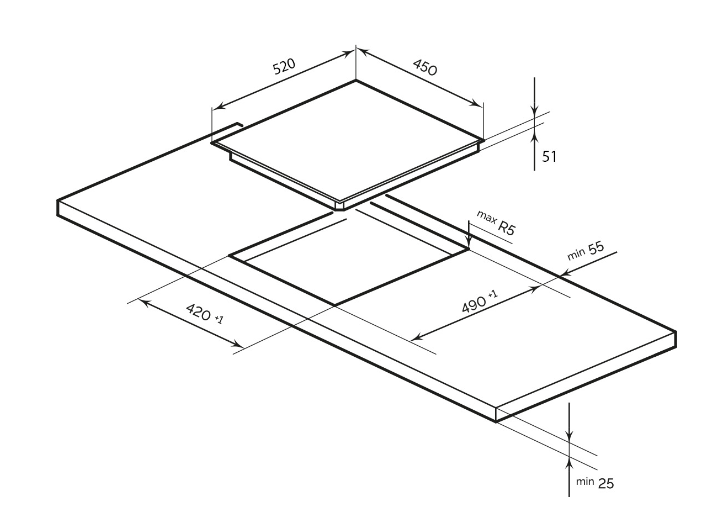 i Характер огранки фаски на внешней стороне варочной панели. Металлические рамки предотвращают забивание монтажных швов крошками и пылью.