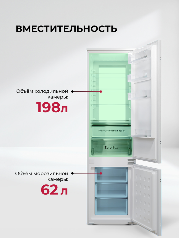 i Общий объем всех отделений морозильной камеры. Для длительного хранения замороженных продуктов выбирайте модели с объемом от 100-150 л.