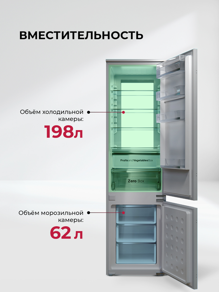i Общий объем всех отделений морозильной камеры. Для длительного хранения замороженных продуктов выбирайте модели с объемом от 100-150 л.
