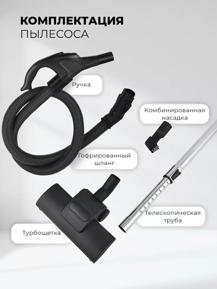Гофрированный шланг, Телескопическая трубка, Турбощетка, Щелевая насадка |