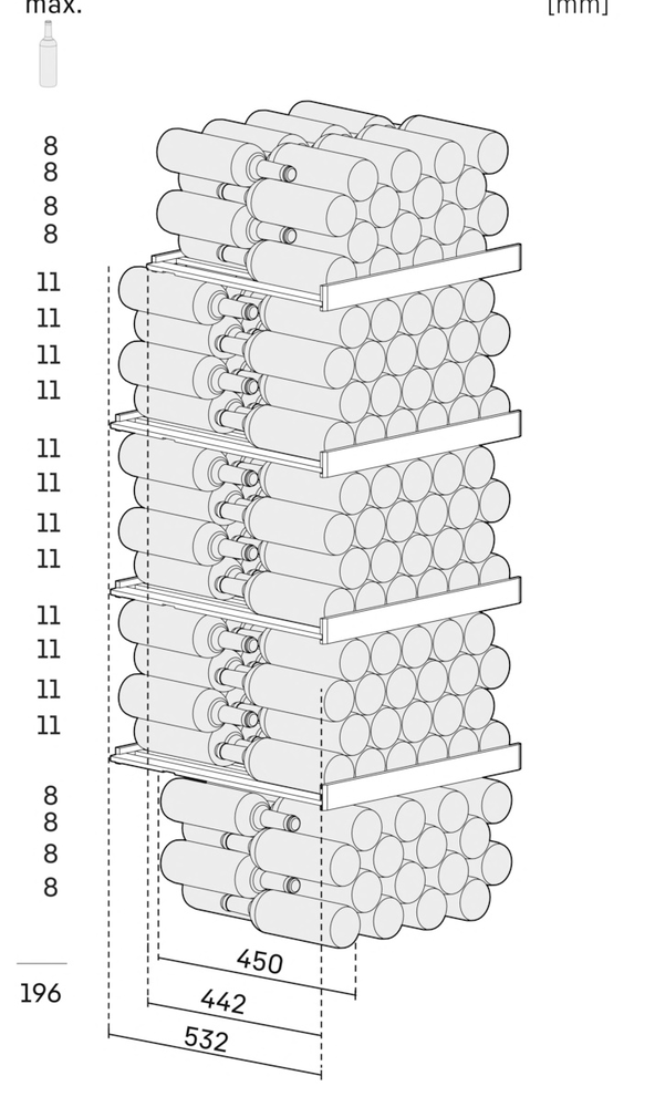 i Вместимость или емкость винного шкафа определяется количеством установленных в нем ячеек для бутылок со стандартным объемом 0,75 л.