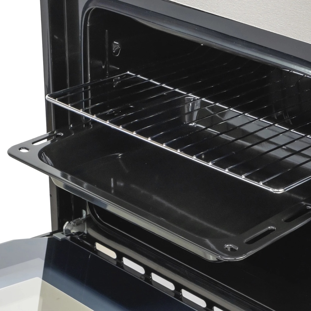 i Выдвижные металлические полозья, которые легко выезжают за пределы камеры духовки вместе с противнем, не давая ему упасть.