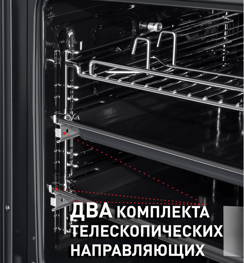 i Выдвижные металлические полозья, которые легко выезжают за пределы камеры духовки вместе с противнем, не давая ему упасть.