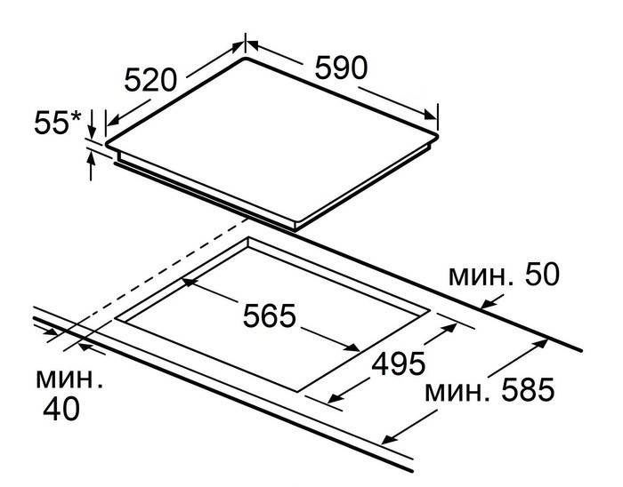 i Характер огранки фаски на внешней стороне варочной панели. Металлические рамки предотвращают забивание монтажных швов крошками и пылью.