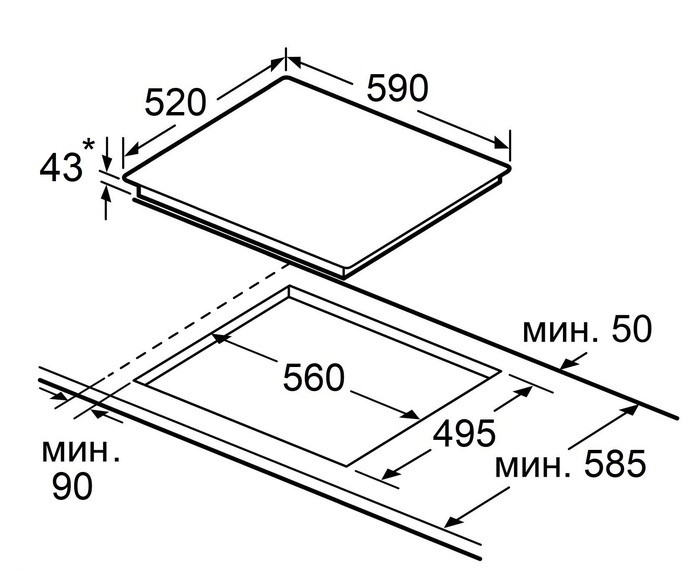 i Характер огранки фаски на внешней стороне варочной панели. Металлические рамки предотвращают забивание монтажных швов крошками и пылью.