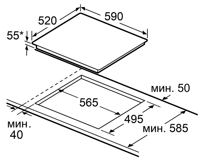 i Характер огранки фаски на внешней стороне варочной панели. Металлические рамки предотвращают забивание монтажных швов крошками и пылью.