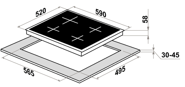 i Характер огранки фаски на внешней стороне варочной панели. Металлические рамки предотвращают забивание монтажных швов крошками и пылью.