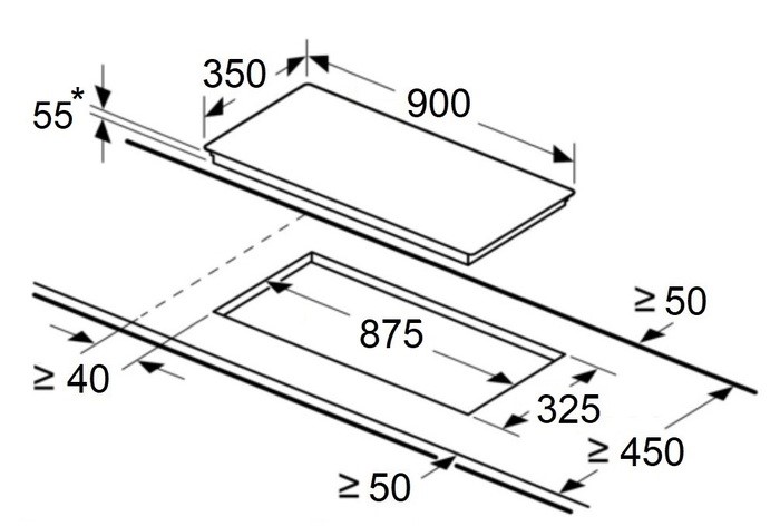 i Характер огранки фаски на внешней стороне варочной панели. Металлические рамки предотвращают забивание монтажных швов крошками и пылью.