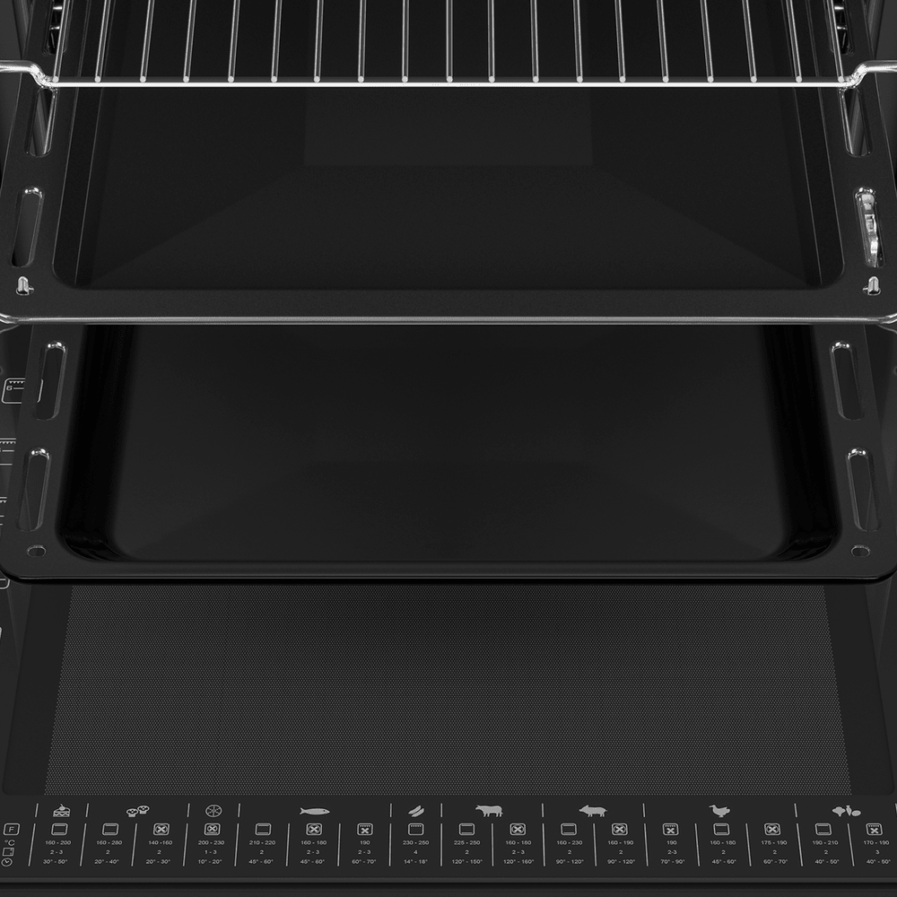 i Выдвижные металлические полозья, которые легко выезжают за пределы камеры духовки вместе с противнем, не давая ему упасть.