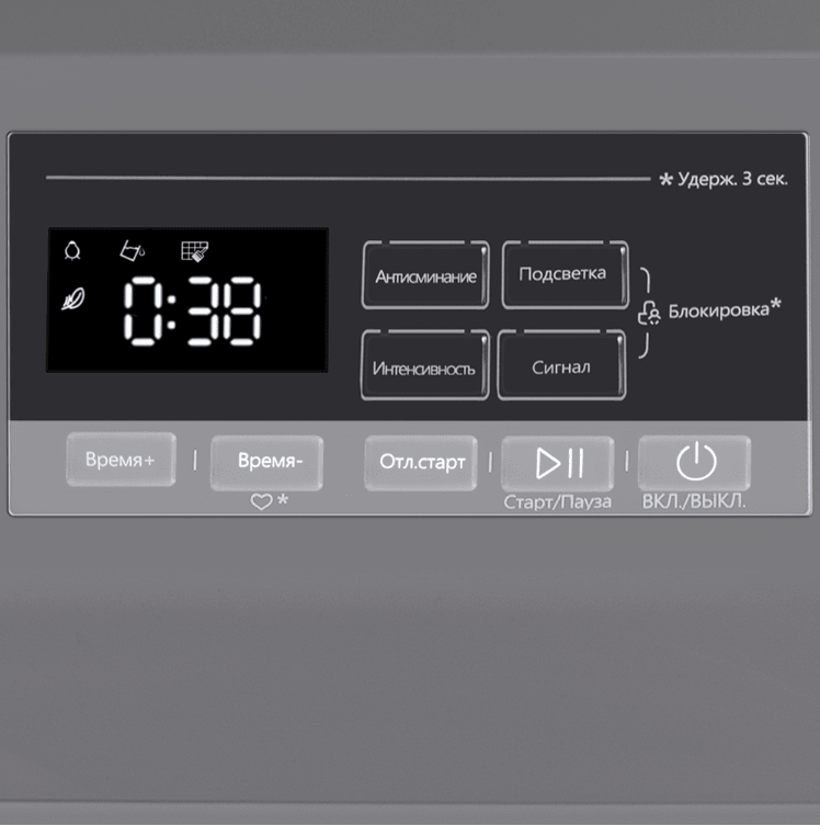 i Небольшой экран на передней панели прибора. Помогает выбирать программу, менять настройки. На дисплее выводятся сообщения об ошибке.