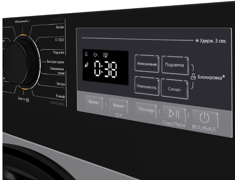 i Встроенная в барабан подсветка позволяет лучше контролировать процесс загрузки белья и вовремя убрать неподходящую вещь.