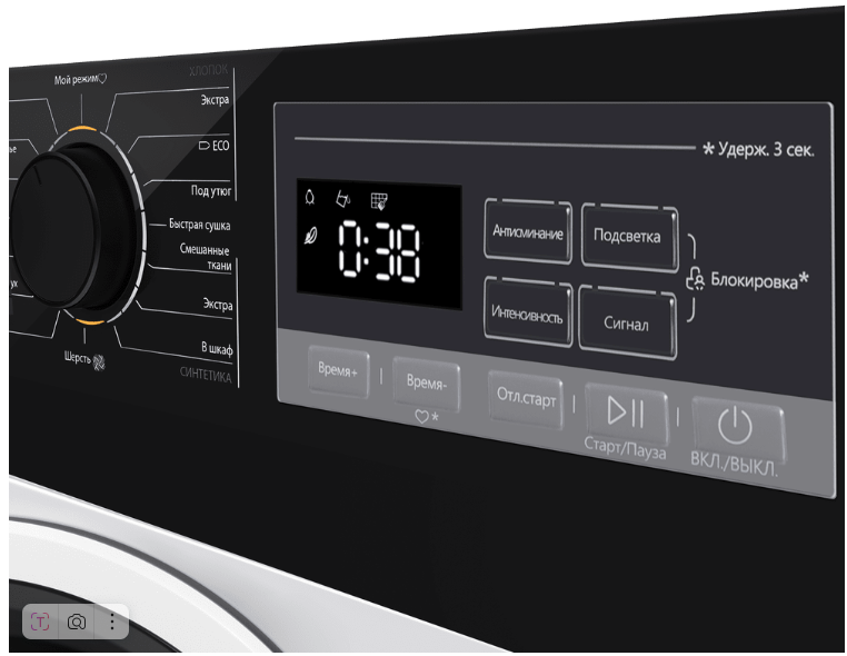 i Встроенная в барабан подсветка позволяет лучше контролировать процесс загрузки белья и вовремя убрать неподходящую вещь.