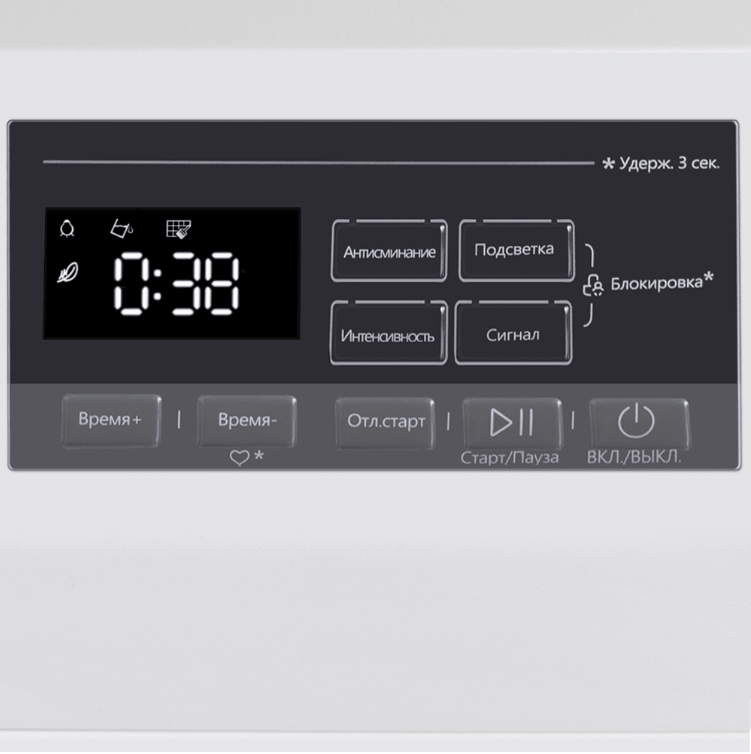 i Небольшой экран на передней панели прибора. Помогает выбирать программу, менять настройки. На дисплее выводятся сообщения об ошибке.