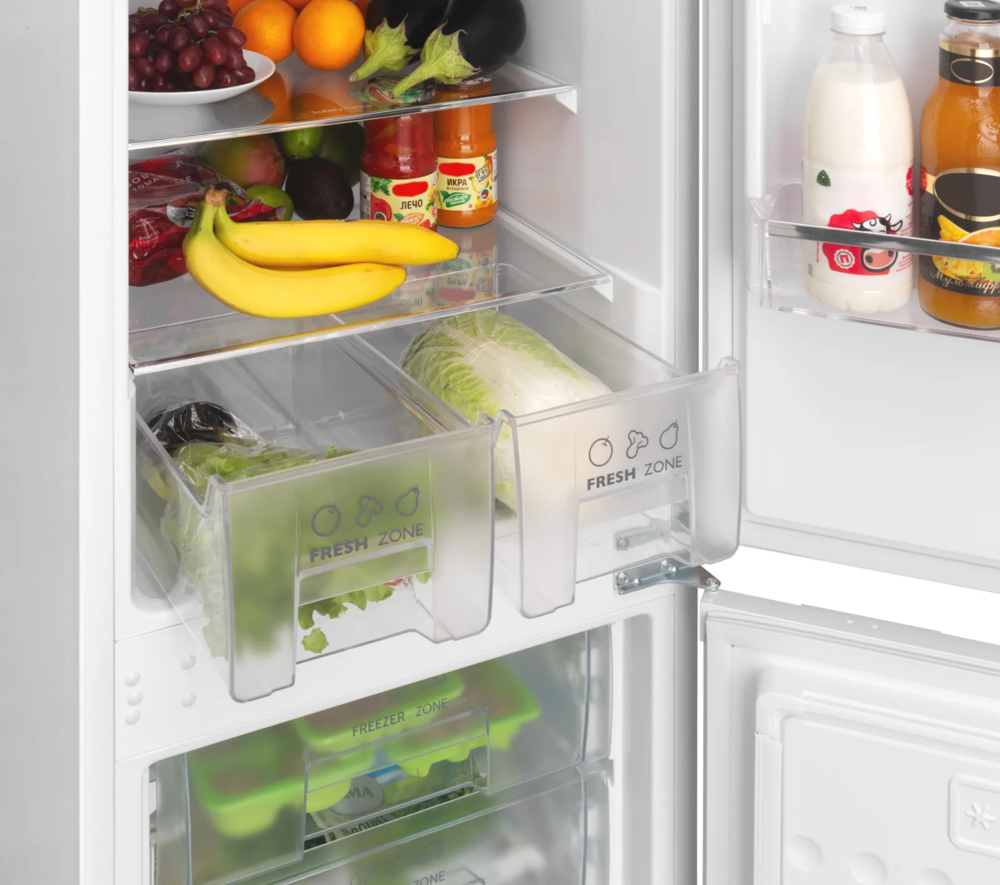 i В зоне свежести температура держится на уровне 0°С, так продукты дольше остаются свежими. Подходит для свежего мяса, рыбы, фруктов, овощей.
