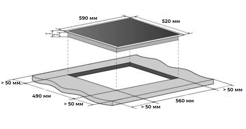 i Характер огранки фаски на внешней стороне варочной панели. Металлические рамки предотвращают забивание монтажных швов крошками и пылью.