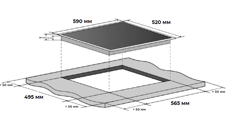i Характер огранки фаски на внешней стороне варочной панели. Металлические рамки предотвращают забивание монтажных швов крошками и пылью.