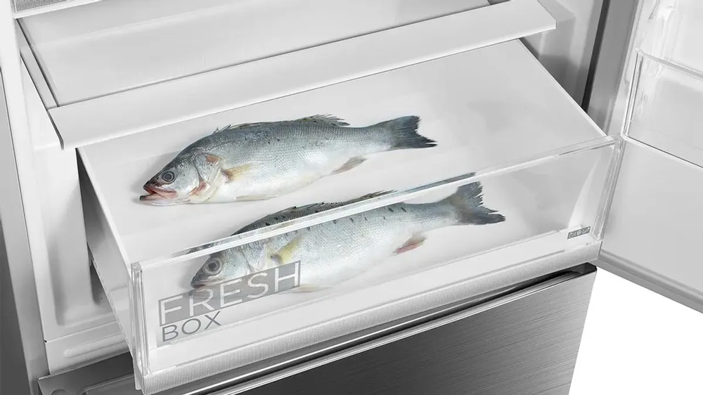i В зоне свежести температура держится на уровне 0°С, так продукты дольше остаются свежими. Подходит для свежего мяса, рыбы, фруктов, овощей.