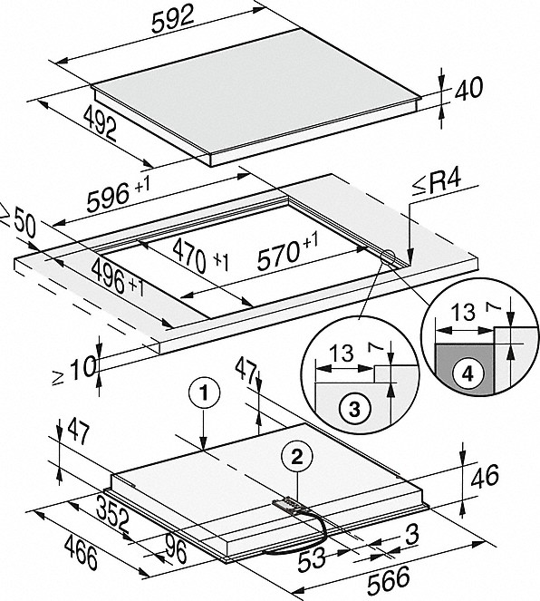 i Характер огранки фаски на внешней стороне варочной панели. Металлические рамки предотвращают забивание монтажных швов крошками и пылью.