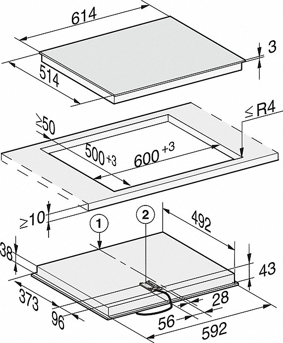 i Характер огранки фаски на внешней стороне варочной панели. Металлические рамки предотвращают забивание монтажных швов крошками и пылью.