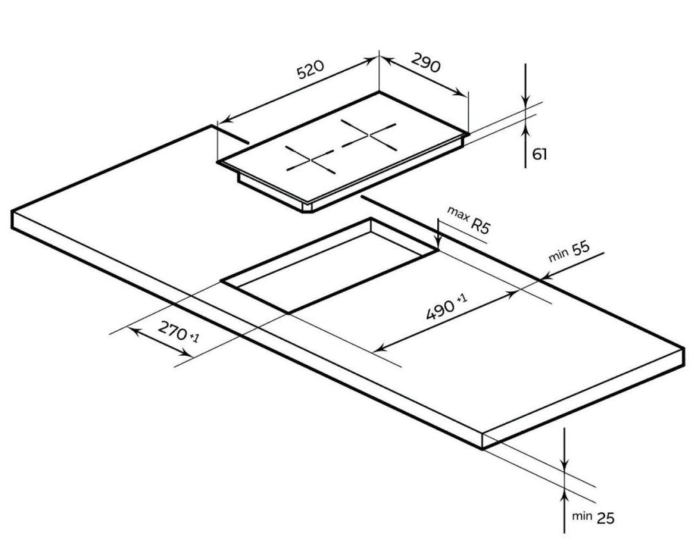 i Характер огранки фаски на внешней стороне варочной панели. Металлические рамки предотвращают забивание монтажных швов крошками и пылью.