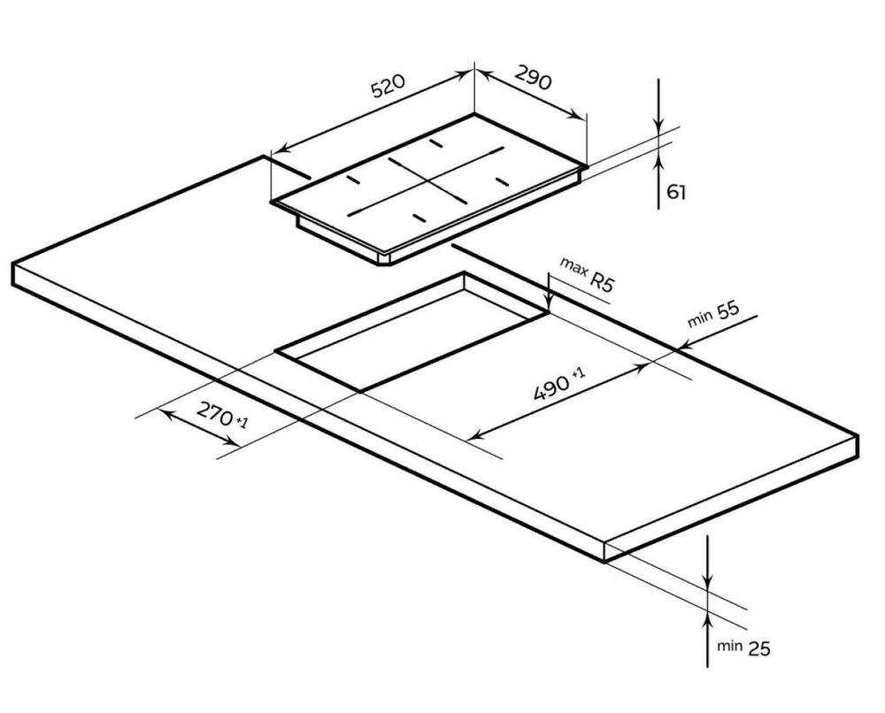 i Характер огранки фаски на внешней стороне варочной панели. Металлические рамки предотвращают забивание монтажных швов крошками и пылью.
