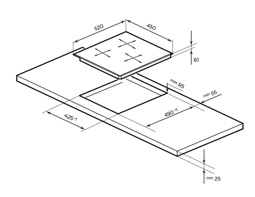 i Характер огранки фаски на внешней стороне варочной панели. Металлические рамки предотвращают забивание монтажных швов крошками и пылью.