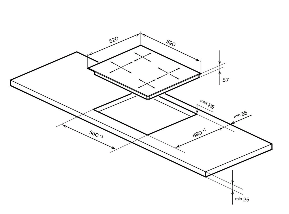 i Характер огранки фаски на внешней стороне варочной панели. Металлические рамки предотвращают забивание монтажных швов крошками и пылью.