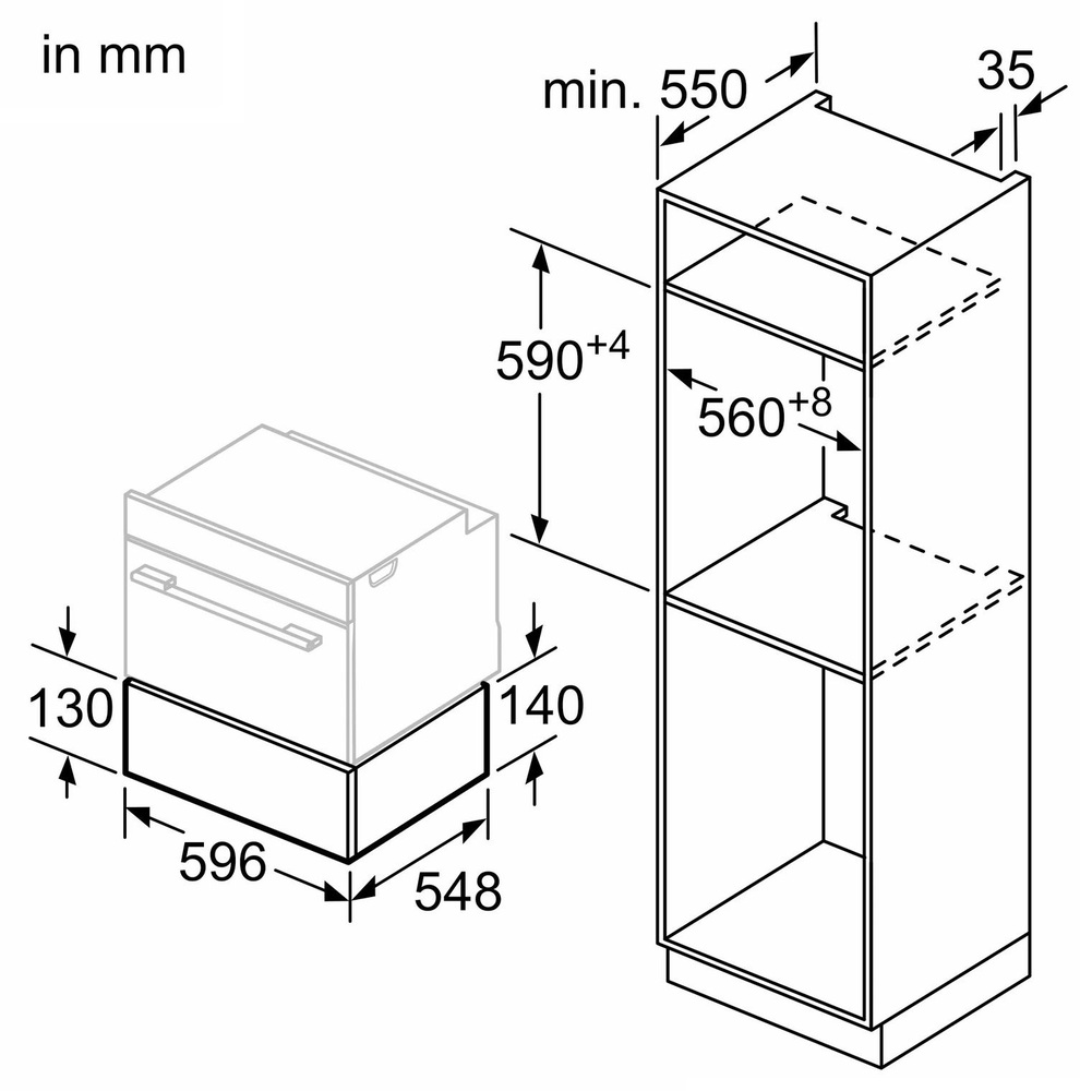 Ящик для подогрева Flex Design 14 см, профили не входят в комплект, приобретаются в качестве обязательных аксессуаров в 4 цветах по вашему выбору, открывание Push-Pull, объем 20 л, вместимость до 25 кг, выдвижная тележка на телескопических направляющих, 4 режима нагрева, 6-ступенчатый контроль температуры, Home Connect, выдвижной ящик, который можно использовать в сочетании с кофемашиной