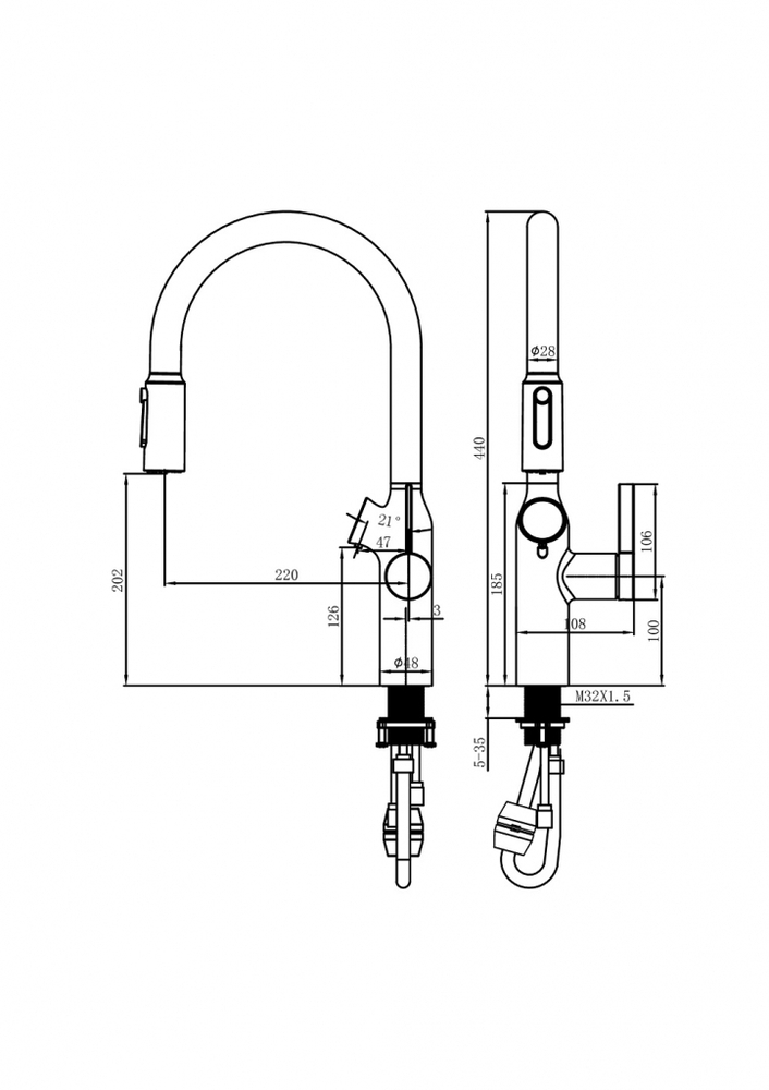 i Встроенная в кран насадка на длинном гибком шланге с металлической оплеткой. Насадки с кнопкой могут переключать обычный излив воды на душ.