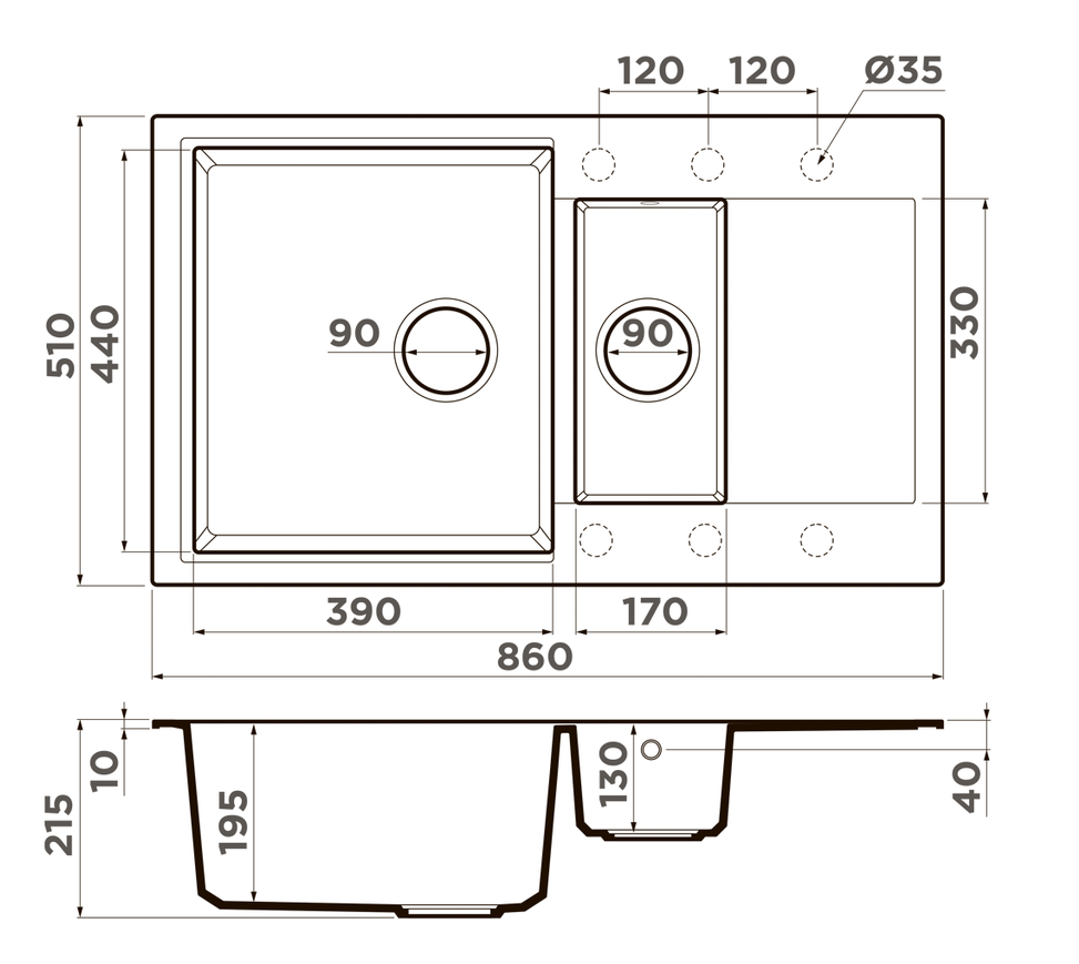 i Расстояние от дна до верхней кромки чаши мойки. Оптимальная глубина — 15-18 см. Чем глубже мойка, тем меньше брызг попадет наружу.