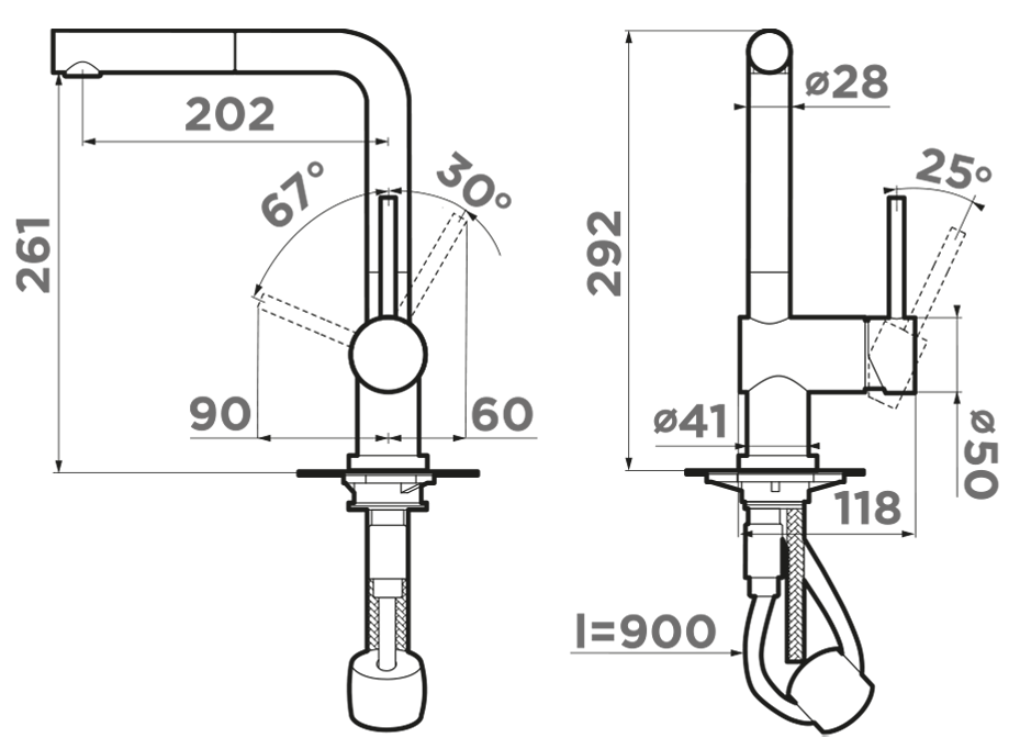 i Встроенная в кран насадка на длинном гибком шланге с металлической оплеткой. Насадки с кнопкой могут переключать обычный излив воды на душ.