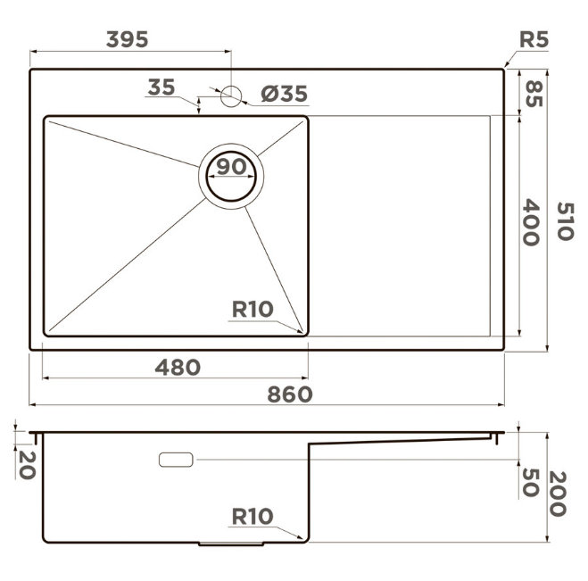 Omoikiri Akisame 86-L Side-GB, мойка, нержавеющая сталь, чаша слева