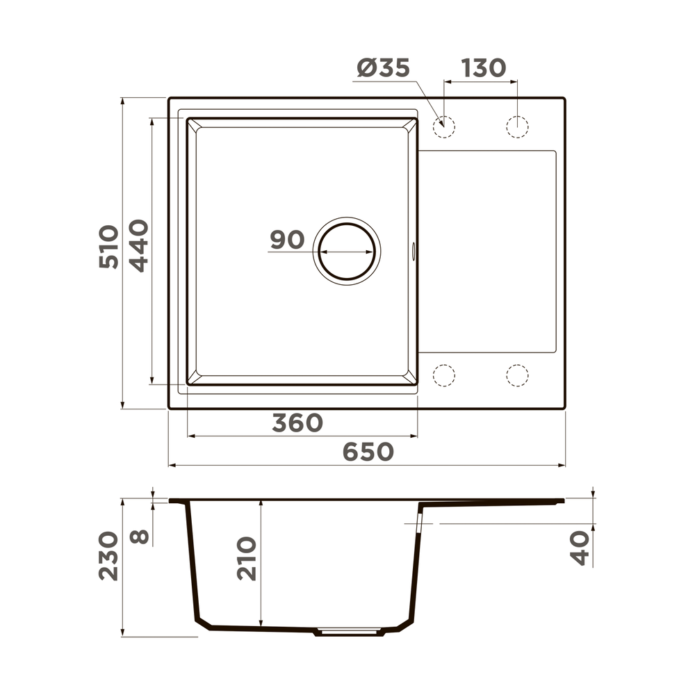 i Расстояние от дна до верхней кромки чаши мойки. Оптимальная глубина — 15-18 см. Чем глубже мойка, тем меньше брызг попадет наружу.